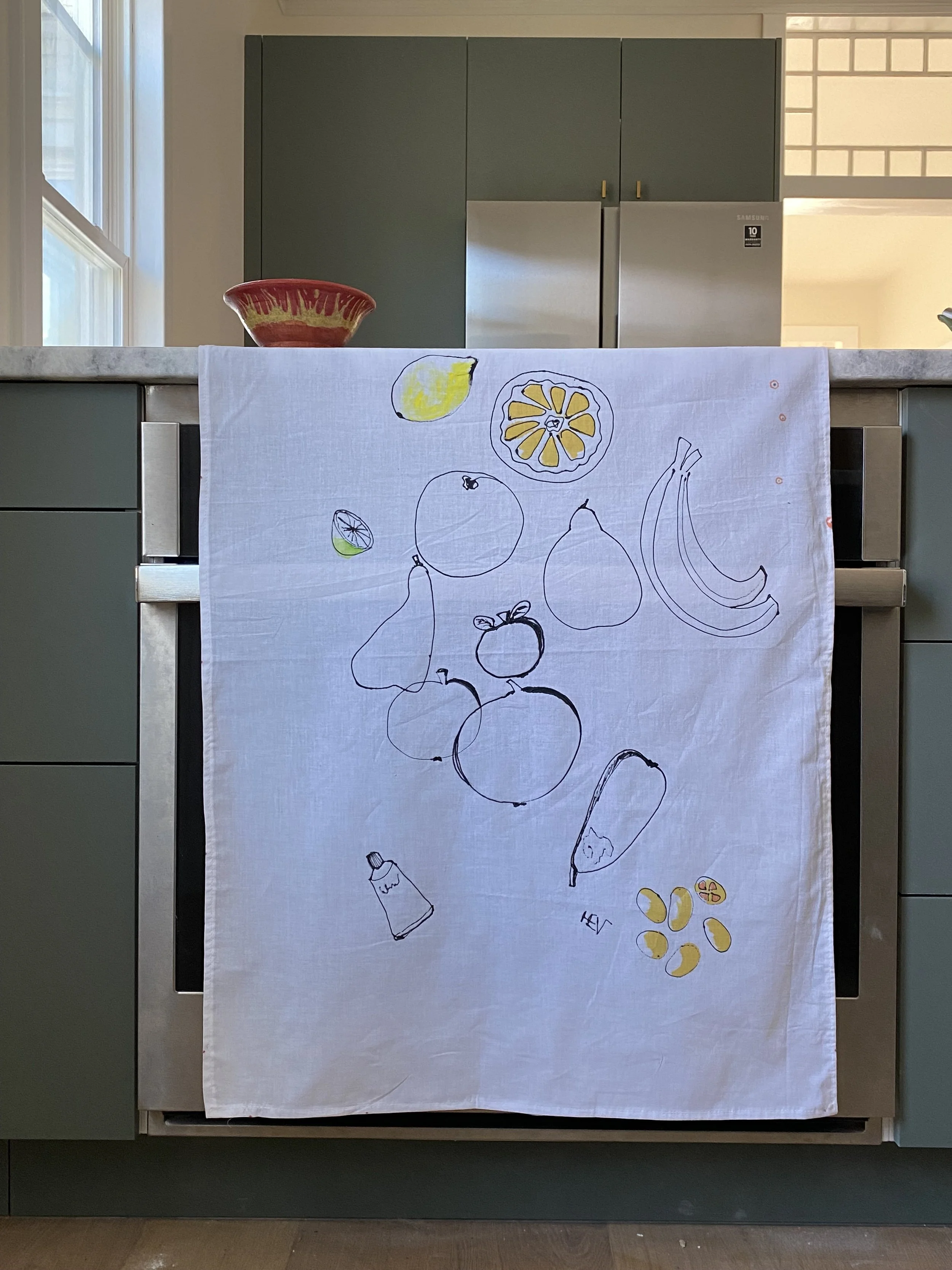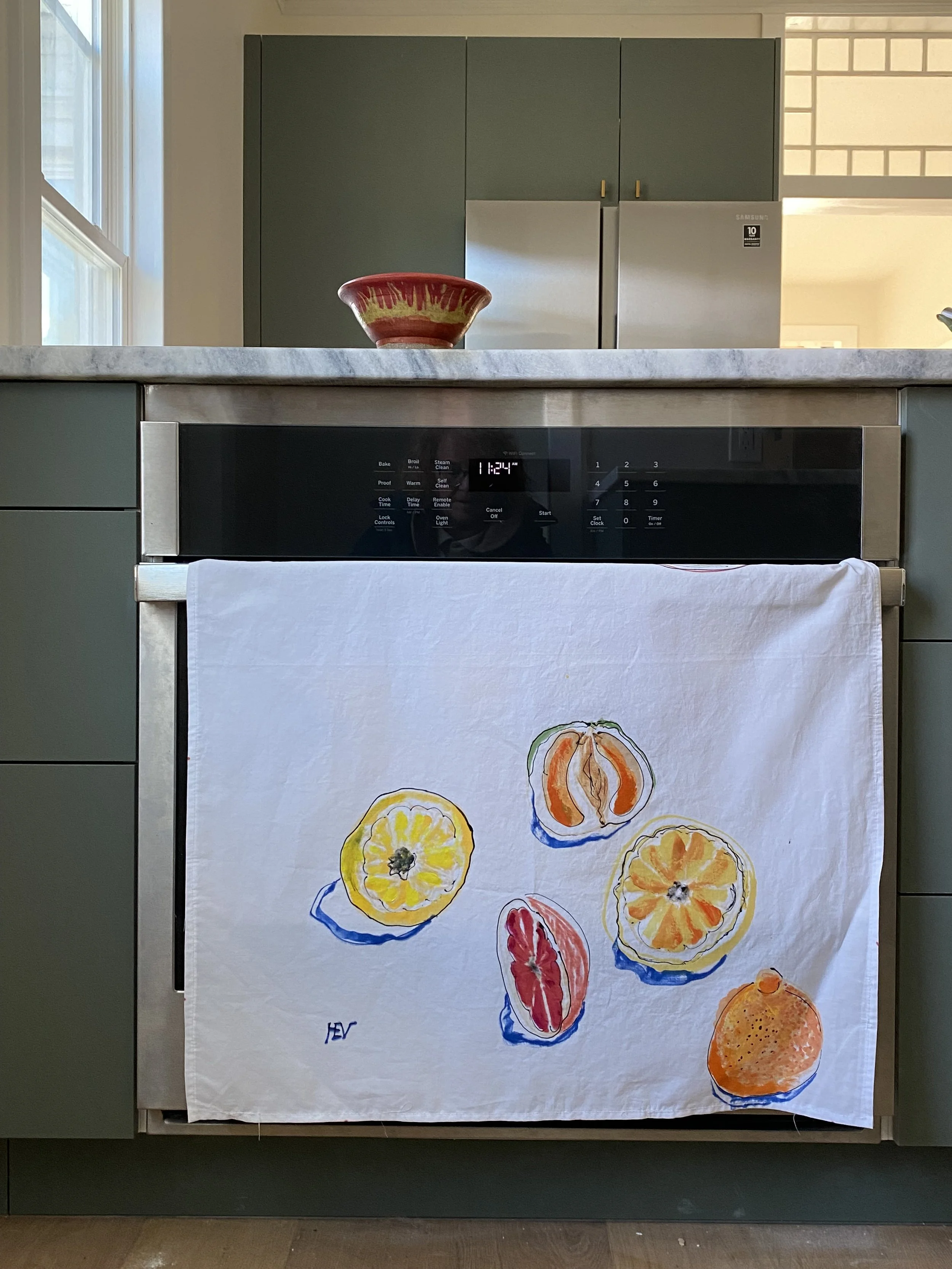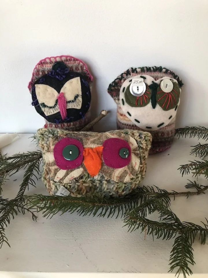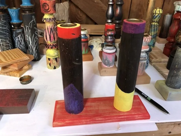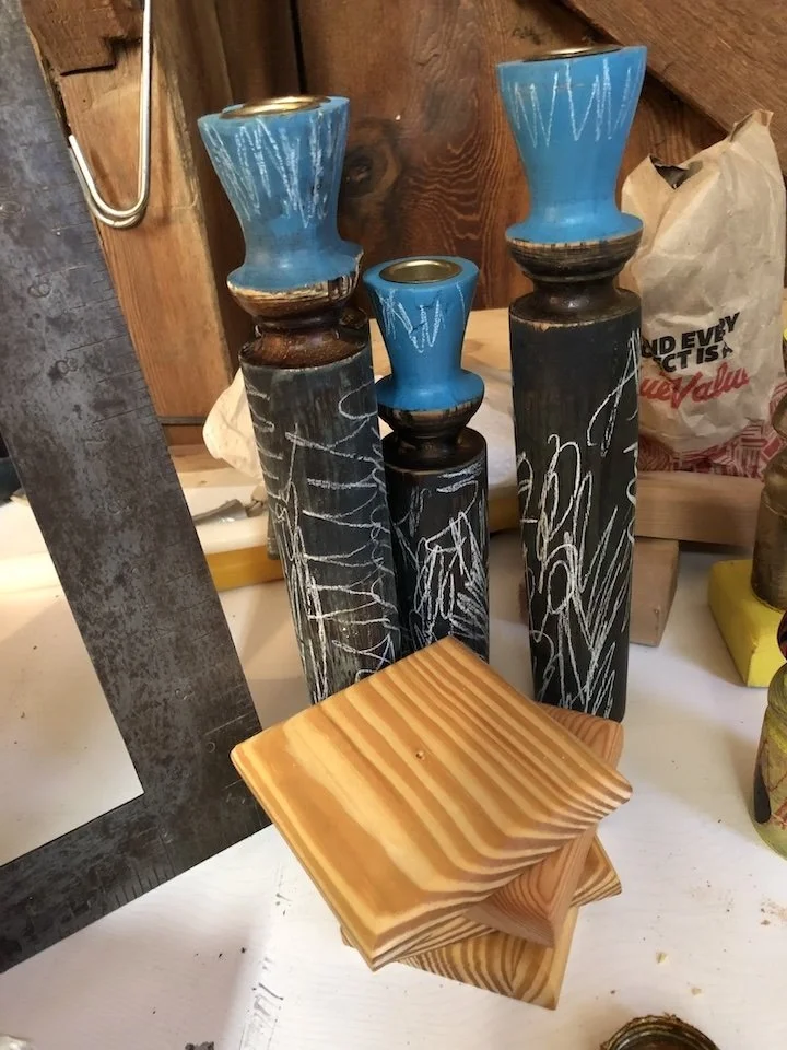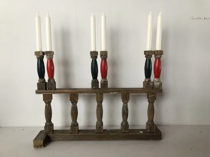 For the market, we usually design something specific and functional, like candlesticks, spindlesticks, made of old porch spindles, bobèches or candle rings, clay fired and hand painted or Christmas tree decorations made of clay and felted wool. Last year, I sewed and hand painted 20 dishcloths, to be used, or draped over the oven door for fun.
